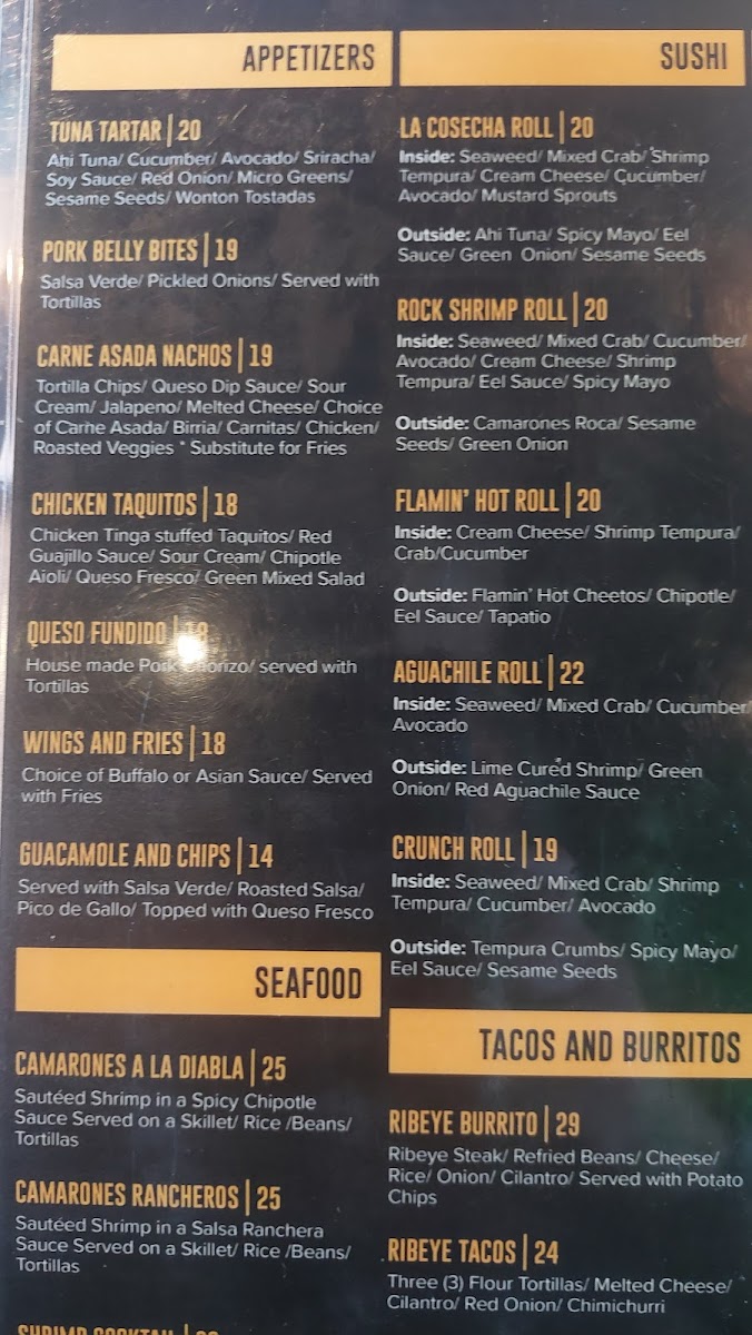 Inside; cream cheese, shrimp tempura, crab, cucumber, Outside; Flamin ' hot cheetos, chipotle , eal sauce, tapatio