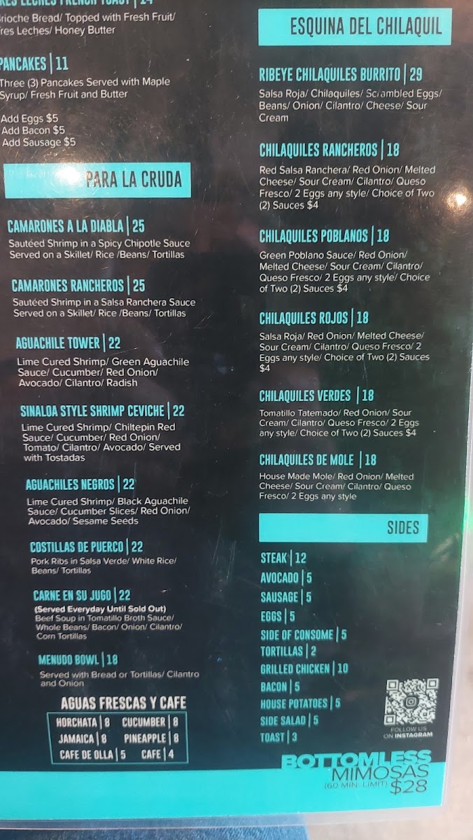Choice of poblano green, red, or mole sauce. Served with chopped red onion, melted Oaxacan and Monterey cheese, sour cream, cilantro, queso fresco, two eggs any style, house potatoes